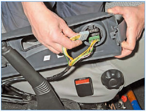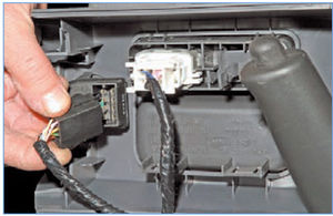 Отсоединяем колодку проводов от гнезда прикуривателя и снимаем переднюю часть облицовки туннеля пола.