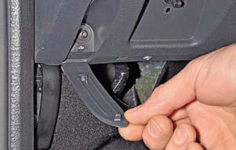 Выводим нижние фиксаторы из отверстий в панели приборов и снимаем обивку левой передней стойки.