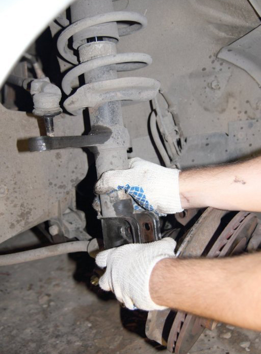 8. Головкой на 19 мм отверните гайки болтов крепления стойки к поворотному кулаку, удерживая болт от проворачивания ключом на 17 мм.