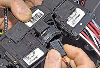 Нажав на фиксатор колодки проводов, отсоединяем колодку от разъема соединителя и, отсоединив колодки проводов от подрулевых переключателей, снимаем соединитель с переключателями в сборе.