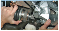 Резким движением в сторону коробки передач досылаем привод до места. Потянув за корпус внутреннего шарнира или поддев его монтажной лопаткой, убеждаемся в фиксации хвостовика корпуса в полуосевой шестерне.