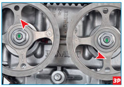 3. Установив крышку головки блока цилиндров, инструментальной головкой или отрезком трубы подходящего размера запрессовываем новые сальники распределительных валов в гнезда головки блока цилиндров, предварительно нанеся на рабочие кромки сальников тонкий слой моторного масла. Проверив фазы механизма газораспределения и зафиксировав валы, устанавливаем зубчатые шкивы на носки распределительных валов так, чтобы эмблемы Renault, нанесенные на спицах шкивов, расположились вертикально вверх (вал выпускных клапанов) и вниз (вал впускных клапанов). Наживив гайки крепления шкивов, слегка подтягиваем их.