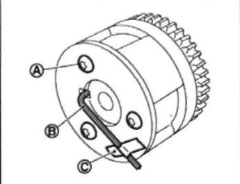d. Во время выполнения вышеуказанной операции Вы услышите щелчи изнутри звездочки распредвала впускных клапанов (звук, указывающий на выход внутреннего стопорного штифта из зацепления). Услышав этот звук, медленно проверните звездочку распредвала впускньи клапанов против часовой стрелки в положение максимального опережения.