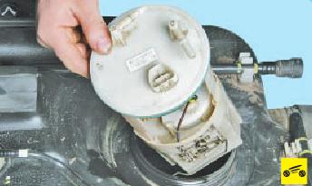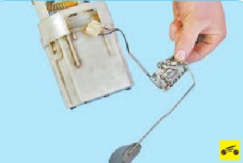 - 14. Отожмите фиксатор и отсоедините колодку проводов от разъема датчика уровня топлива.