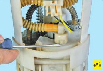 - 7. Отожмите фиксатор и отсоедините колодку жгута проводов от топливного модуля.
