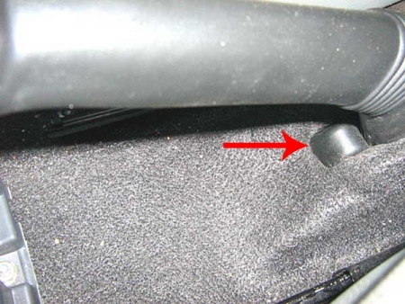 3. Отодвиньте чехол под рычагом ручного тормоза и ослабьте регулировочную гайку троса уравнителя рычага ручного привода тормоза с помощью воротка с насадкой.
