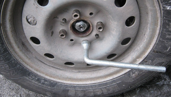 3. Вывесьте переднюю часть автомобиля. Снимите передние колеса с помощью балонного ключа.