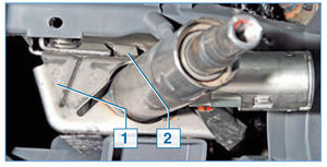 …сдвигая верхний кронштейн 1 рулевой колонки с выступа 2 кронштейна поперечной балки.