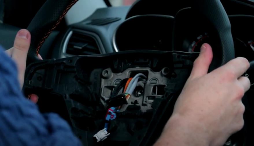 7. Установите руль в обратном порядке и затяните болт его крепления. Вставьте пластиковую вставку и подключите проводку.