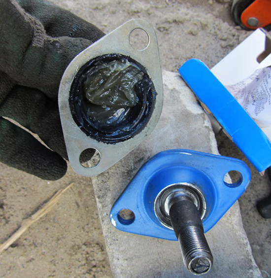 Не используйте старую опору с порванным пыльником. В этом случае перед установкой шаровой опоры замените пыльник, предварительно заложив в него консистентную смазку типа Литол на половину его объема, а только потом приступайте к обратной установке шаровой опоры.