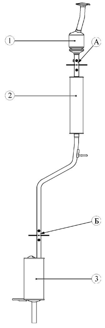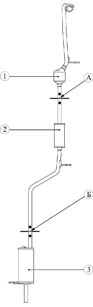 Отработавшие газы отводятся из двигателя через выпускной коллектор и систему выпуска газов, включающую в себя каталитическиий нейтрализатор 1, рисунки 12-1 и 12-2, глушитель 2 дополнительный и глушитель 3 основной. Система выпуска газов выполнена в виде единой сварной конструкции, которая подвешена к кузову автомобиля с помощью резиновых подушек. Возможна замена отдельных узлов системы выпуска газов с применением резки трубопроводов и дальнейшей сборки с помощью ремонтных зажимных муфт. Для этой цели на системе выпуска предусмотрены две зоны А и Б для выполнения резки. Со стороны каталитического нейтрализатора система выпуска при помощи шпилек крепления и гаек крепится фланцем к выпускному коллектору.