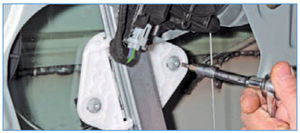 Ключом «Torx Т-20» или головкой «на 8» отворачиваем два самореза крепления стекла к ползуну стеклоподъемника.