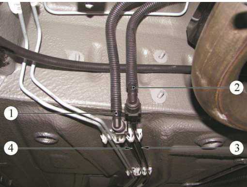 3. Отверните три гайки 1 крепления защиты 2 шлангов топливной магистрали и снимите защиту топливных шлангов.