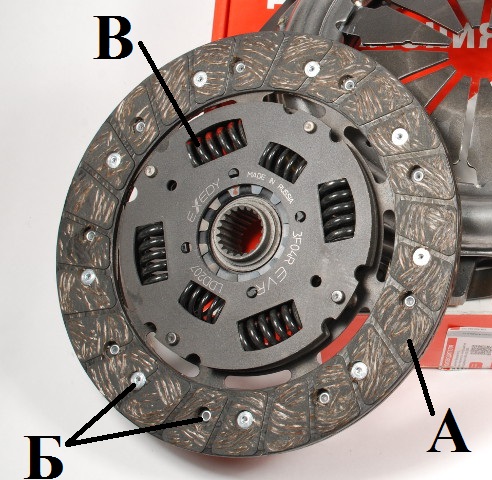 1. Трещины на деталях ведомого диска сцепления не допускаются. Проверьте износ фрикционных накладок сцепления А. Если головки Б заклепок углублены менее чем на 0,2 мм, поверхность фрикционных накладок сцепления замаслена или ослаблены заклепочные соединения, то ведомый диск сцепления необходимо заменить. Проверьте надежность фиксации демпферных пружин В в гнездах ступицы диска сцепления, при сломанных пружинах диск сцепления необходимо заменить.