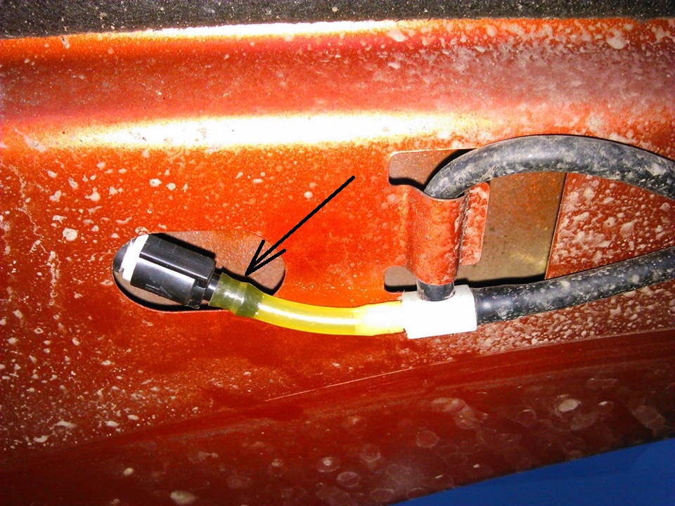 2. Отсоедините шланг омывателя ветрового стекла от тройника, и вытяните шланг из полости в каркасе капота.