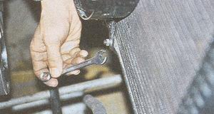 5. Ключом «на 10» отворачиваем две гайки верхнего крепления кожуха вентилятора к радиатору.