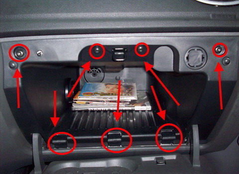 3. Ключом Torx T25 отворачиваем три нижних и четыре верхних самореза крепления вещевого ящика Форд.