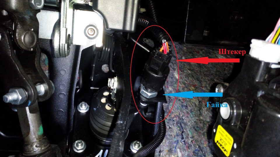 Выключатель расположен на кронштейне педального узла под панелью приборов.