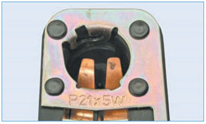 5. Аналогично заменяем лампу 1 противотуманного света P21W (лампу света заднего хода P21W в правом заднем фонаре). Замену комбинированной лампы P21/5W габаритного света и сигнала торможения (см. «Замена лампы головного света в блок-фаре, комбинированной лампы габаритного света и сигнала торможения в заднем фонаре»)