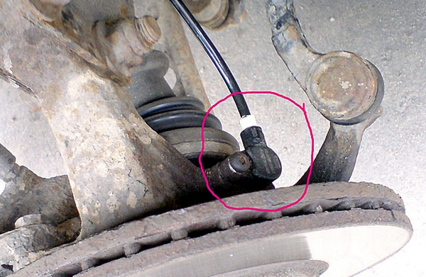 6. Отсоедините колодку проводного жгута от датчика скорости вращения колеса (для автомобилей, оборудованных антиблокировочной системой).