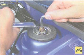 8. Накидным ключом на 21 мм и шестигранником на 6 мм ослабьте крепежную гайку верхней части стойки амортизатора.