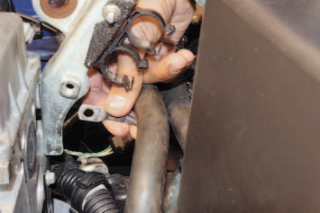 29. Ослабляем хомуты крепления трех шлангов системы охлаждения. Для этого необходимо пассатижами сжать отогнутые усики этих хомутов. Затем сдвигаем все хомуту вниз по шлангам.