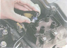 37. Разжав фиксатор, отсоединяем от модуля зажигания колодку проводов.
