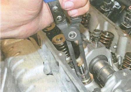 Если нет под рукой инерционного съемника, то можно для этих целей применять пассатижи или специальный съемник клещевого типа. В этом случае, для спрессовки маслосъемного колпачка, усилие должно прикладывать строго вверх. При этом запрещается пытаться проворачивать колпачок, т. к. это приведет к повреждению втулки клапанна.