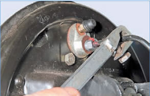 5. Поднимаем рычаг привода стояночного тормоза. За счет этого верхние концы тормозных колодок заднего колеса отойдут от упоров поршней колесного цилиндра.