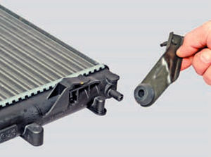 На установочных штифтах каждого радиаторного бачка имеются нижние опорные подушки. Снимите их и замените, если были оказались сдавленными, изношенными и потрескавшимися.