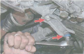 16. Поддомкратив двигатель, выкручиваем и вынимаем два болта крепления кронштейна задней опоры подвески двигателя.