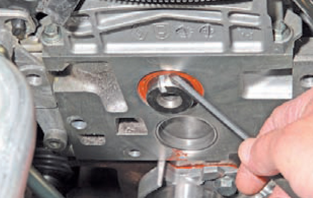 6. Воспользовавшись тонкой отверткой, извлекаем сальник из гнезда в головке блока цилиндров.