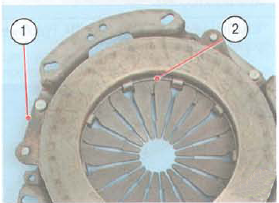 8. Осматриваем соединительные звенья (1) кожуха и диска, стопорные кольца нажимной пружины (2). В этих местах не должно быть трещин и следов износа. При их обнаружении, нажимной диск заменяется в сборе.