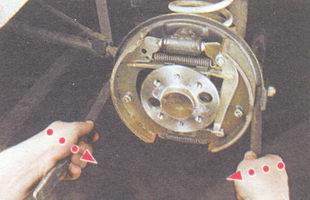 15. С помощью монтажных лопаток сводим тормозные колодки.