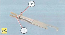 18. На резьбовую часть стержня распорной планки (1) наносим тугоплавкую смазку для тормозных механизмов, после чего наворачиваем на него гайку (2) но не затягиваем ее до конца.