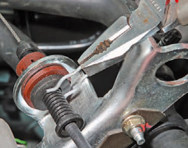 6. Полностью вытягиваем трос в моторный отсек и снимаем его с автомобиля.