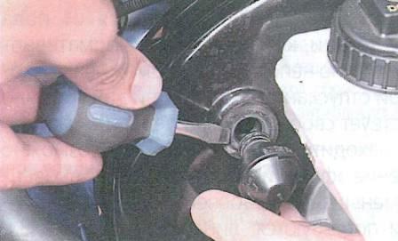 2. Снимаем с вакуумного усилителя тормозов шланг, который ведет к впусной трубе. Для этого отверткой поддеваем обратный клапан шланга.