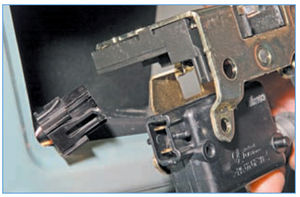 При необходимости отсоединяем от замка тягу внутренней ручки открывания двери и снимаем электропривод замка. Эти операции аналогичны соответствующим операциям, показанным на замке задней двери.
