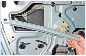 Для снятия цилиндрового механизма замка передней двери снимаем нижнюю направляющую стекла и отсоединяем тягу цилиндрового механизма от замка (см. выше).
