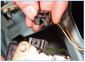 Отжав фиксатор колодки проводов, отсоединяем колодку от электропривода замка и снимаем замок в сборе с электроприводом.