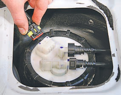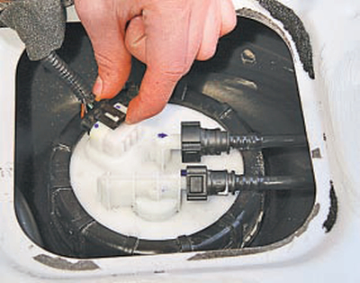 9. Подсоедините к топливному насосу колодку жгута проводов и установите детали в порядке, обратном снятию.