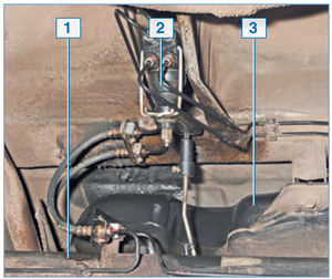 На автомобиле без АБС жидкость к тормозным механизмам задних колес поступает через регулятор давления, расположенный на днище кузова, перед балкой задней подвески.