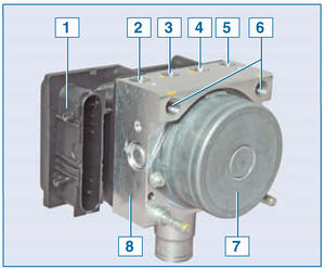 Блок АБС, закрепленный в моторном отсеке на правом лонжероне, около щитка передка, состоит из гидравлическего блока, модулятора, насоса и блока управления.