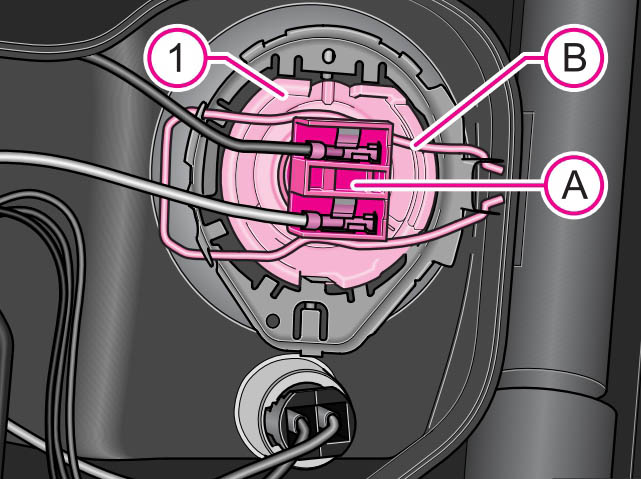 8. В лампе 1 ближнего света, отсоедините штекерный соединитель "А" и отцепите упругую проволочную петлю "В" прижатием по направлению к лампе накаливания и наискось вниз.