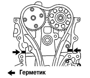 3. Нанесите герметик на крышку цепи привода ГРМ, как показано на рисунке (толщина слоя 3–4 мм).
