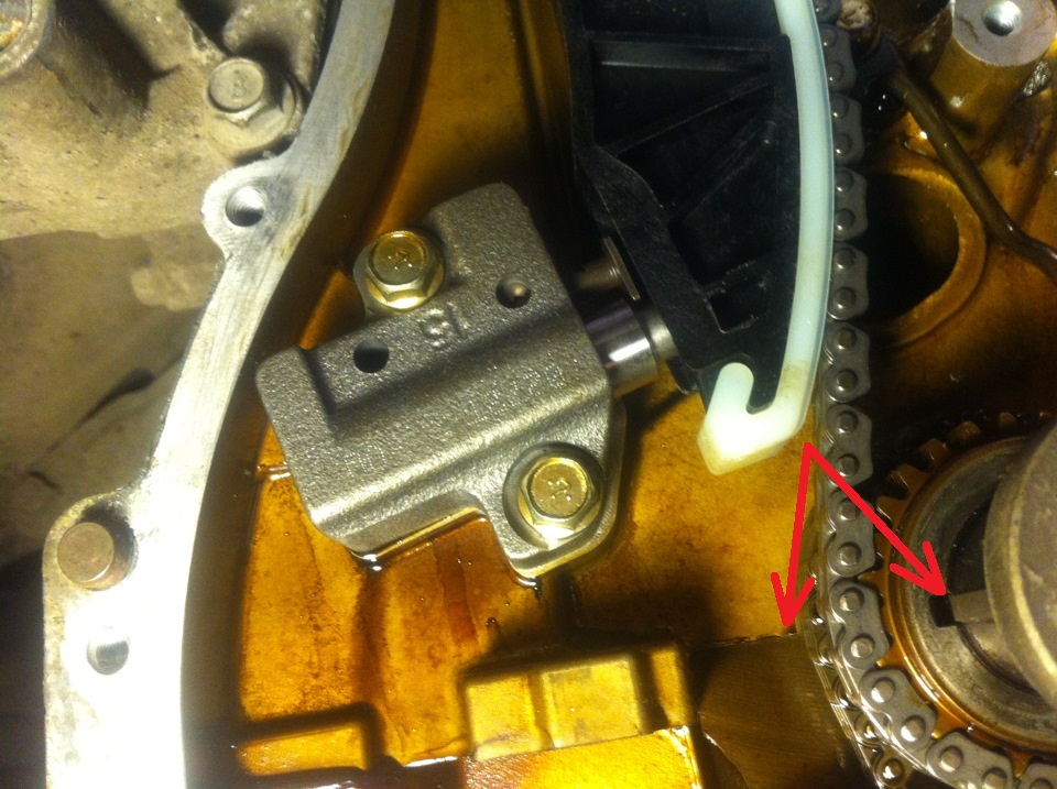 7. Если метки звездочки коленчатого вала не совпадают, снимите цепь привода ГРМ и поверните коленчатый вал по часовой стрелке досовпадения меток.