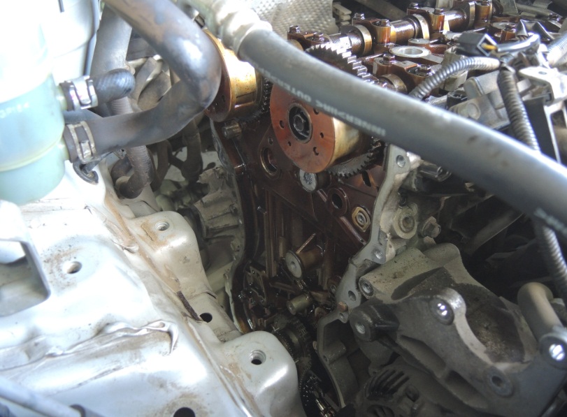 7. Если метки звездочки коленчатого вала не совпадают, снимите цепь привода ГРМ и поверните коленчатый вал по часовой стрелке досовпадения меток.
