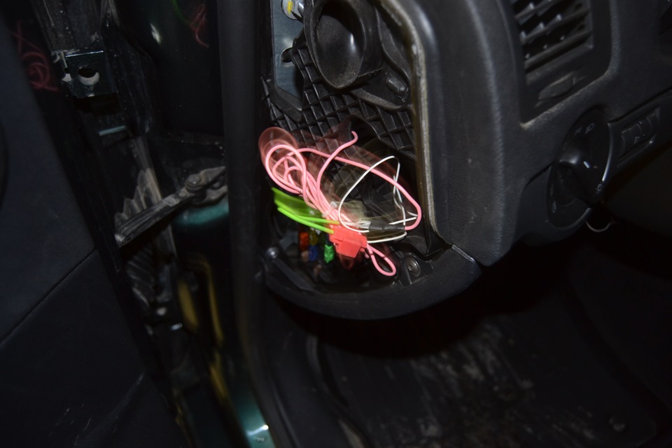 Снимаем короб для АКБ, находим толстый жгут проводов. Затем лезем в салон, снимаем пенопластовый кожух под приборной панелью над педалями, находим толстый жгут проводов, берем проволоку и протыкаем отверстие, потом высовываем наружу эту проводку. Скручиваем провод и проволоку и тянем обратно в салон проволоку, вместе с которой затянется провод. В моем случае это розовый провод, который идет на выключатель.