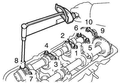 5. Установите и равномерно затяните десять болтов крепления крышек подшипников в несколько проходов моментом затяжки 16 Н·м в последовательности, показанной на рисунке.