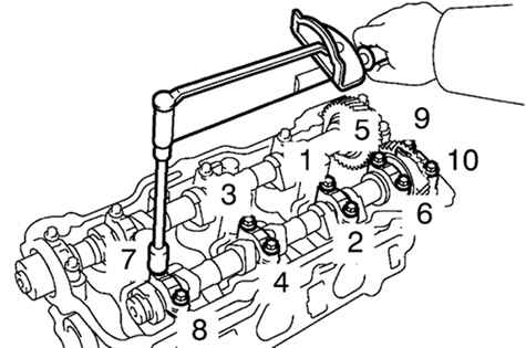 Нанесите тонкий слой моторного масла на резьбу и под головки болтов крепления крышек подшипников. Установите и равномерно затяните десять болтов крепления крышек подшипников в несколько проходов моментом затяжки 16 Н·м в последовательности, показанной на рисунке 2.299.